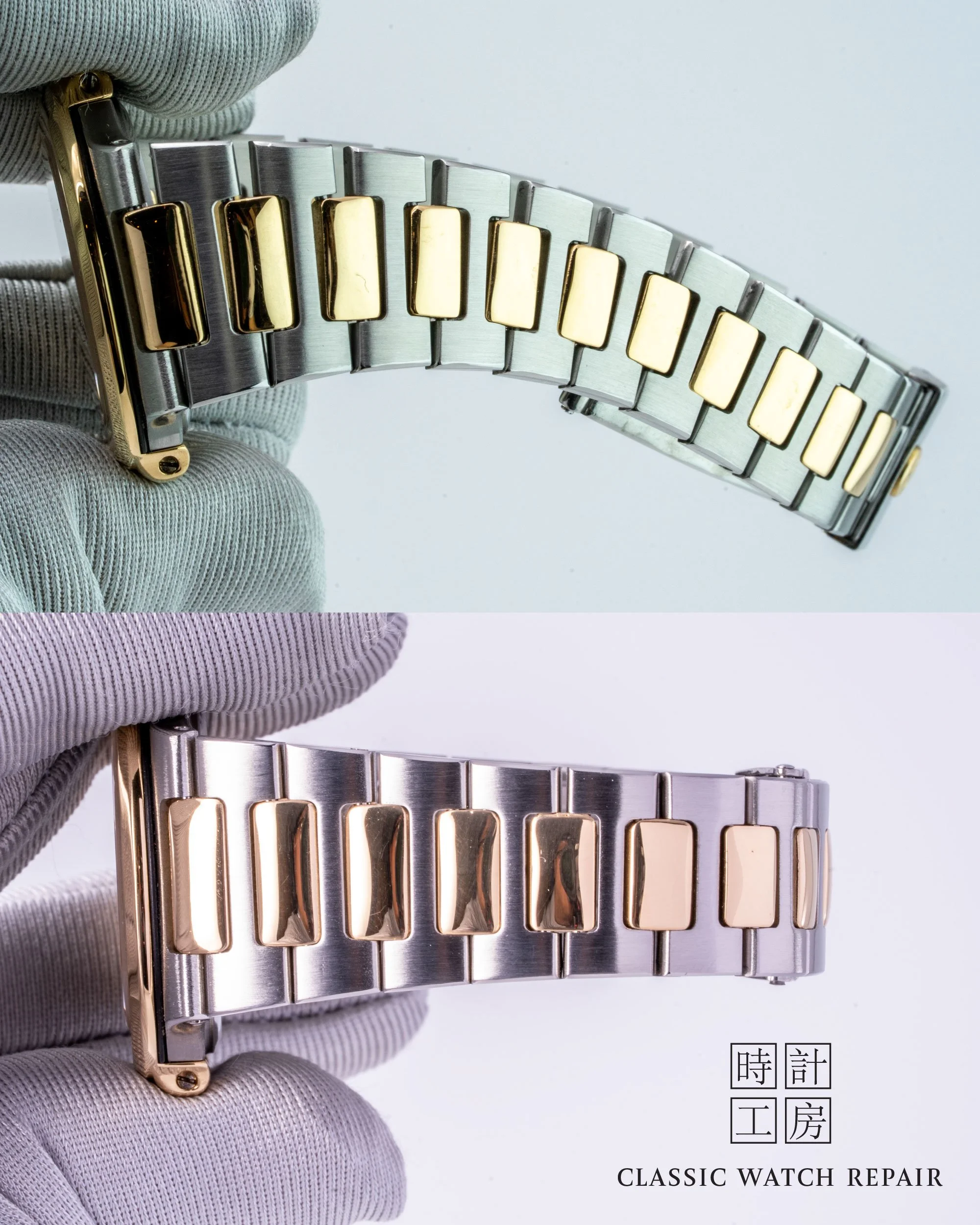 進行錶帶修復時,我們會將條帶逐格拆開,用雷射焊接技術(Laser Welding)修補崩凹,同時更換並強化所有內格柱芯,從而消除每格之間的虛位,俗稱「拉帶」。完成拉緊錶帶後,我們亦會重新打磨及抛光錶帶,去除花痕同時回復出廠時的光澤。