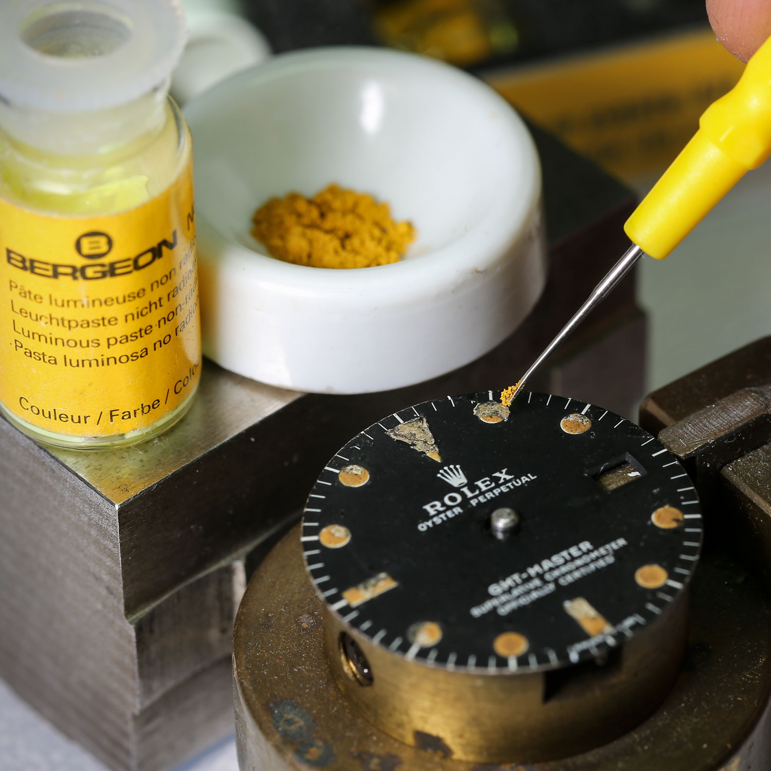 錶盤及錶針修復:錶面翻新、翻填錶面及錶針夜光、針面對色、舊化、修補裂痕、花痕移除、翻印錶面。